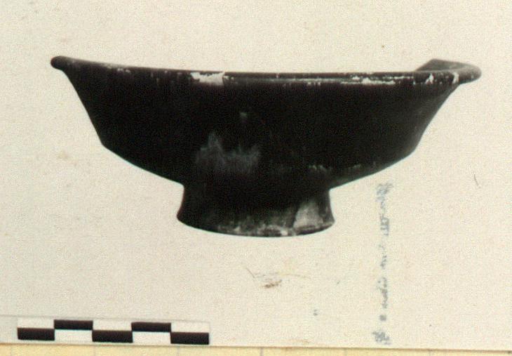 | Description: | About half preserved; mended from four pieces. Slightly flaring ring foot, bottom rises to nipple; angular walls, ending in flaring rim. Scratched in bottom on inside: <graphic> Orange clay. Peeling metallic black glaze. | |