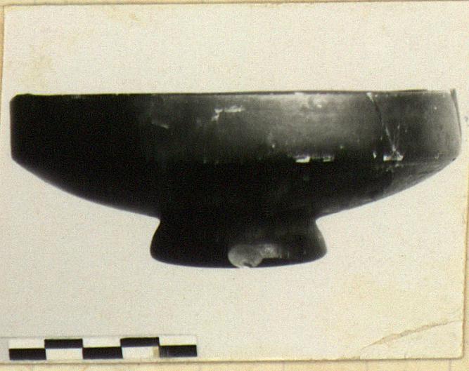 | Description: | About half preserved; mended and restored in plaster. Flaring ring foot with nipple; sharply flaring walls; high vertical rim. Two grooves near base of wall. On wall, floral pattern with multi-pronged leaves (oak?) in white and buff. Dark orange clay. Black to brown glaze. White and buff paint. ADDENDA Though published as a bowl, this shape is held to be a lid by GRE. | |