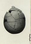 Description:   Mended from many pieces. About one-fourth of body wall missing. Egg-shaped body with plain flat base and irregular knob at top. Knob slightly undercut, perhaps for a string to be tied around it. At height of ca. 0.15m. fragment retains traces of corner of slot cut before pot was fired.