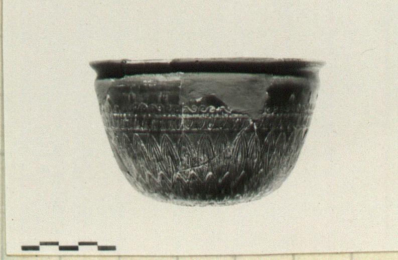 | Description: | Mended from several pieces and restored in plaster; largely complete. Medallion: debased rosette surrounded by scraped groove and row of dots. Middle zone: from medallion springs a row of pointed leaves surmounted by two rows of lozenge-shaped leaves, made by reversing the half-leaf pattern for the bottom half of the leaves. Rim pattern: a row of ribbed leaves surmounted by a row of double spirals, this in turn topped by palmettes over junction of every second spiral. Orange clay. Metallic black glaze. | |