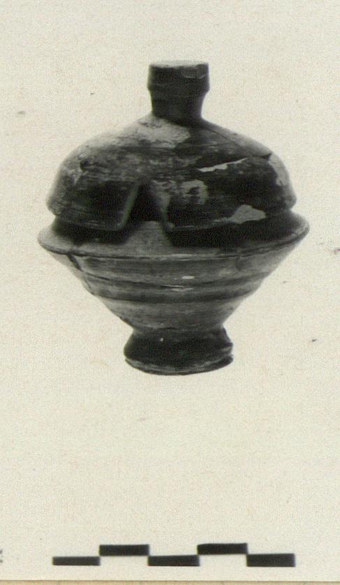| Description: | a) Mended from eight pieces. Chips missing. Conical bowl with raised disk foot. Lip flares inward with outer flange for lid. b) Mended from seven pieces. Small chips missing from edge. Convex domed lid with tall flat handle. Flaking black glaze over buff clay. Pyre type. | |