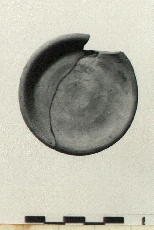 | Description: | Mended from two pieces. Fragment missing from rim. Discolored by fire. Roughly wheelmade unglazed saucer with flat base. Pinkish-buff clay. | |
