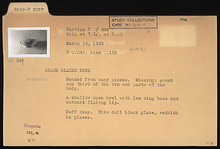 Description:   Mended from many pieces. Missing about one-third of the rim and parts of the body. A shallow open bowl with low ring base and outward flaring lip.