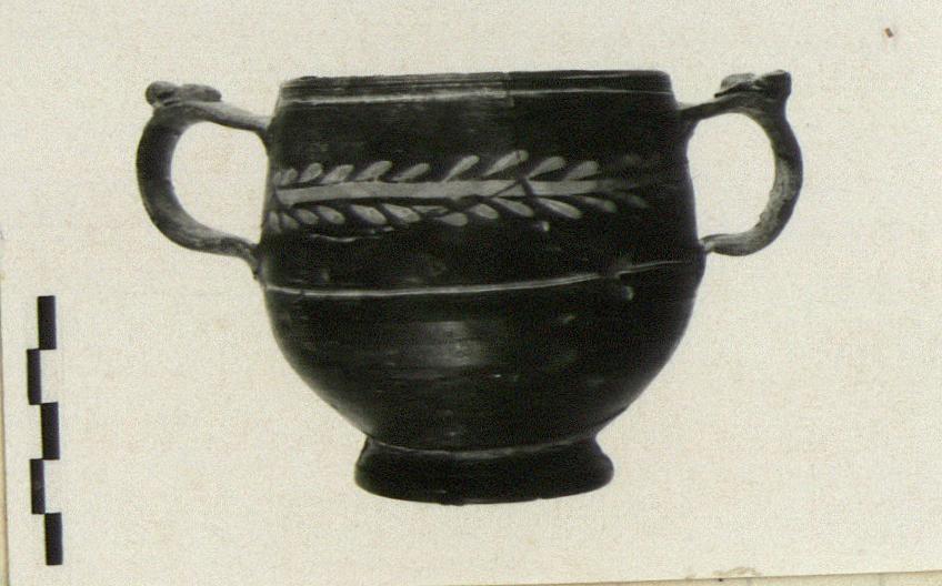 | Description: | Mended from 27 pieces. Missing about one-fifth of rim. Offset ring foot. Bottom rises to nipple. Strap handles from belly to below rim, with mask-applique thumb-grips. Scraped horizontal grooves at both upper and lower points of handle attachment. Between grooves is horizontal garland in gray slip. Black glaze over reddish-gray clay. Grayish slip. | |