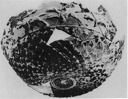 | Description: | Lower half of bow preserved, mended from seven pieces. Medallion: rosette surrounded by groove under glaze and scraped groove with miltos; from this spring 15 rows of small pointed leaves. Middle zone: torch race; continuous frieze of riders bearing torches, one being crowned by a Nike or Eros. Rim pattern: trace of spiral preserved. Pale orange clay. Black glaze, largely worn away. Cf. P 28594. | |