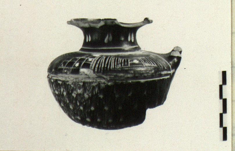 | Description: | Mended from six pieces; complete except for handle and chips.Bottom half moulded. Base madallion: a rosette surrounded by a scraped groove with miltos from which spring eight rows of oblong (lotus?) leaves increasing in size toward the top; scraped groove with miltos about halfway up vase. Wheel made above the groove. Curved, almost horizontal shoulder decorated with panels of decreasing rectangles alternating with panels of checkerboard pattern, done in clay and added white paint. Neck decorated with scraped groove with miltos, pairs of teardrops in clay and blobs in added white. Broadly flaring flanged rim; trace of vertical double handle, from shoulder to lip. Orange clay. Black glaze, somewhat worn below. Cf. Agora XXII, no. 406. | |