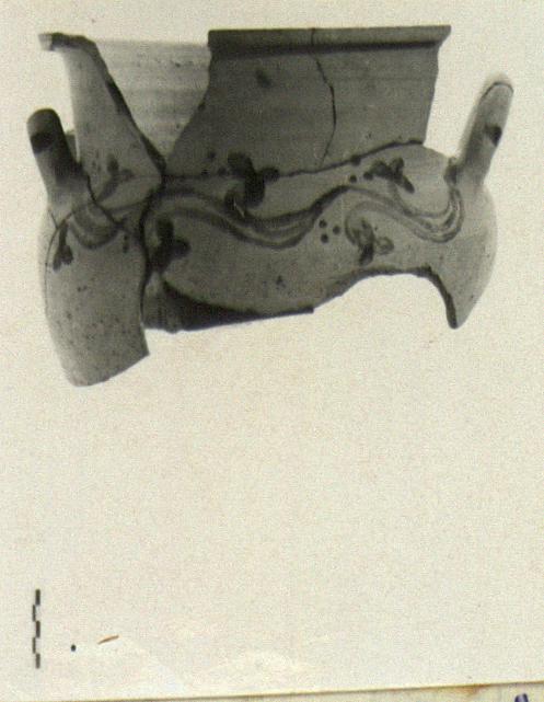 | Description: | Mended from several pieces; one handle, parts of rim, all of bottom and much of sides missing. Upper part of bowl with round body; slightly flaring neck, flat rim with groove on side; steeply canted handles. Painted decoration: tendril with tripartite leaves and groups of three dots. Very coarse dark buff clay. Brown paint. Cf. P 28649. Coarse Ware. | |