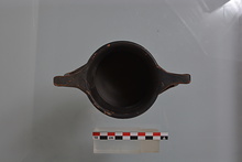 | Description: | Intact. Moulded foot with scraped groove with miltos at junction of mouldings. Groove under glaze on resting surface with narrow scraped band inside concave undersurface. Plain rim. Long thin spurs on handles. Dull black glaze, partly fired red. Orange clay. Cf. Agora XII, no. 713. | |