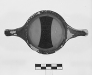 | Description: | Cracked. Chips missing from rim. Similar to P 28705. Dull black to red glaze. Orange clay. ADDENDA P 28705: Moulded foot with scraped groove with miltos at junction of mouldings. Groove under glaze on resting surface with narrow scraped band inside concave undersurface. Plain rim. Long thin spurs on handles. | |