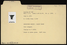 | Description: | Foot chipped. Similar to P 28785. Black to brown glaze. Buff clay. ADDENDA P 28785: Flaring base, flat underside. Flaring mouth. Vertical handles, looped and pinched outward at rim. | |