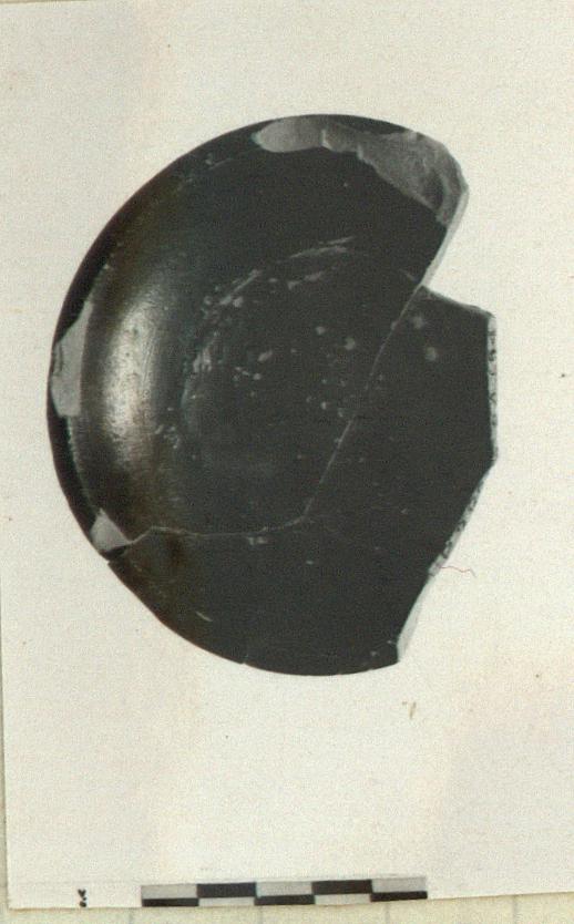 | Description: | Mended from four pieces, lacking about one-third of rim. Ring base with central nipple. Plain rim. Black metallic glaze fired red in small area inside foot, and on floor within stacking line. Red-buff clay. | |