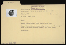 | Description: | Mended from 3 pieces. Chips missing from side. Raised foot with groove separating it from body. Duck-shaped body. Only mouth and neck glazed. Brown clay. Dull black glaze. | |