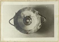 | Description: | Ribbon-handled plate. Mended from three fragments; complete. Two horizontal band handles, roughly attached. Small flat bottom. Buff clay; red glaze on handles and on interior, with a broad reserved band and a central reserved dot. Exterior unglazed, save where the glaze has run over in places from the interior. | |