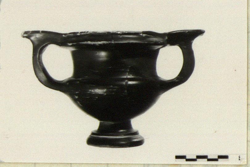 | Description: | Mended from several pieces, restored in plaster. Moulded foot with reserved groove at junction of mouldings. Groove in resting surface. Moulded rim. Long thin spurs on handles. Dull black glaze, partly peeled. Red clay. | |