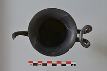 | Description: | Mended. One handle and part of rim missing. Moulded foot with scraped grooves filled with miltos. Plain rim. Loop handles. Black glaze. Gray clay. | |