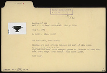 | Description: | Missing much of both handles and part of side wall. Concave underside with nipple. High moulded foot with scraped groove at juncture of bowl with foot. Bowl shape. Loop handle. Dull black glaze. Buff clay. | |