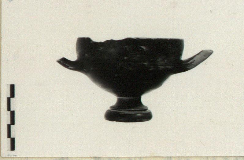 | Description: | Missing much of both handles and part of side wall. Concave underside with nipple. High moulded foot with scraped groove at juncture of bowl with foot. Bowl shape. Loop handle. Dull black glaze. Buff clay. | |