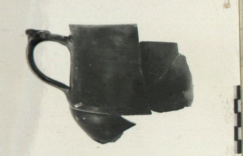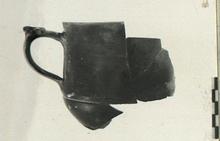 | Description: | Preserved is ca. one-third of cup without foot. Broad top with groove just below handle onset. Thumb-rest is ivy-leaf. Dull black glaze. Orange clay. | |