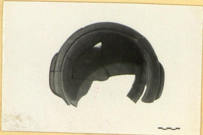 | Description: | About half preserved; mended. Flat bottom; straight slightly flaring side walls; flaring rim with ledge; horizontal loop handles. Gritty red clay, blackened on bottom. | |