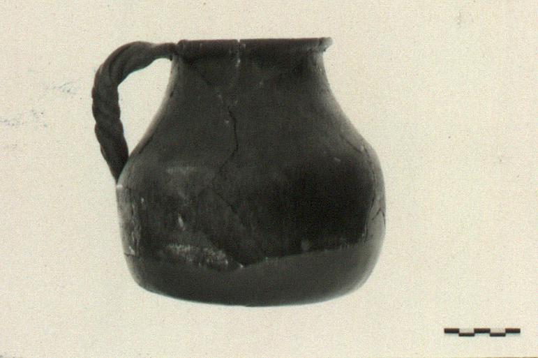 | Description: | Bottom and much of lower wall missing. Convex wall; tapering concave neck; thickened rim, flanged to receive lid; single twisted handle. Coarse gritty red clay, blackened by fire. | |