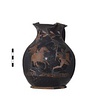 Description:   Mended and restored in plaster. Low flaring foot, trefoil mouth. Ivy wreath on neck. Scene on ground line of ovolos. At center is youth on horse, to right, fluttering drapery, ivy crown. Below are preserved front hooves of another horse. At right is nude youth to right, carrying large rectangular object and holding staff. At left is nude youth carrying large rectangular object on back running right.