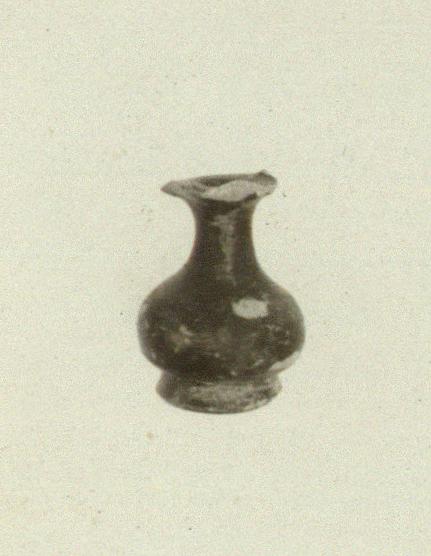 | Description: | Handle broken away. Raised base large in proportion; low swelling body; narrow neck; rim flaring out horizontally, rather wavy (opening very small); handle from lip to shoulder. Attic clay. All-over black glaze, somewhat chipped and peeled. | |