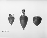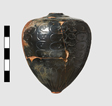 Description:   Mended. Missing foot, neck and handles. Plump squat body. Long ovolos at bottom; maeanders, ovolos, palmettes above.