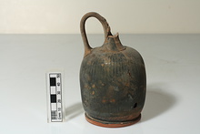 | Description: | Mended. Mouth missing. Low ring foot, reserved. Recessed, reserved underside. Plump and squat tall body. Thin, narrow ribbing. Dull worn black glaze. Red clay. Cf. AMIran 26 (1993), p. 135, n. 171. | |