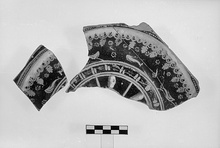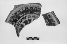 | Description: | Part of a flat plate, decorated in white and yellow. Outside, dots; a zone of wave pattern; palmettes, rosettes and dolphins. Inside, with concentric grooves, pairs of parallel horizontal and vertical lines alternating, and radiations, mostly destroyed. Heavy, grooved, ring base. No rim preserved. | |