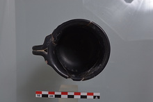 Description:   Mended and restored. Recessed underside. Vertically ribbed body, out-turned rim. Vertical double handle.