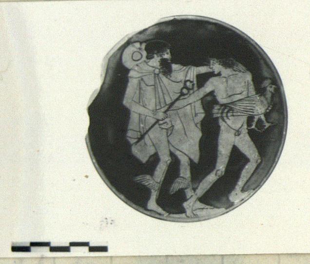 | Description: | a) Chips missing from rim. Depicted is Hermes in chlamys with winged feet and cadeusis to right with left arm resting on shoulder of youth holding cock, also to right. Head of youth turned back to Hermes and right hand clasping Hermes' wrist. b) Fragment of opposite side of a) preserved. Depicted is nude male with long hair, seen frontally. c) Fragment of lower left side of same side as b). Preserved is a piece of flying drapery and a right hand held at body. Also a vertical, possibly a staff; underside preserved. Black glaze, red figure. Orange clay. Addenda July 2024: d) added from Lot ΒΓ 360. Joins with fragment b) near bottom edge, but not mended. Preserves the foot and ankle of the right figure, shin left figure, and a curved object. Underside reserved but finely finished. e) added from Lot ΒΓ 358. Edge of the disk but does not join c). On black-glaze field: top of the striped scepter with finial. Underside reserved with a light groove near edge; otherwise finely finished. Side A [missing since 1974]: Hermes and Ganymede; Side B: probably Zeus and Ganymede. The curved object may be a hoop. ADDENDA Penthesilea Painter (JRG). | |
