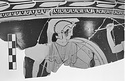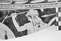 | Description: | Mended from 12 pieces. About half of diameter preserved. Rim is decorated with leaves of laurel over ovolo. Neck decoration: at left a Greek standing frontal with head turned facing out, right. He wears a thin chiton with overfold and is armed with a shield (which he carries on his left arm) and Attic helmet with cheek pieces turned up. They are decorated with bearded serpents. In center is an Amazon facing front with head turned to left. She wears a corselet and cap and has a spear in her upraised right hand. At left, another Amazon dressed similarly, carrying a black shield, holding a spear in her right hand, facing left. Shading of helmet, interior of shield, lines of musculature, hair, in dilute glaze. Red clay. | |