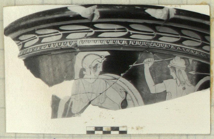 | Description: | Mended from 12 pieces. About half of diameter preserved. Rim is decorated with leaves of laurel over ovolo. Neck decoration: at left a Greek standing frontal with head turned facing out, right. He wears a thin chiton with overfold and is armed with a shield (which he carries on his left arm) and Attic helmet with cheek pieces turned up. They are decorated with bearded serpents. In center is an Amazon facing front with head turned to left. She wears a corselet and cap and has a spear in her upraised right hand. At left, another Amazon dressed similarly, carrying a black shield, holding a spear in her right hand, facing left. Shading of helmet, interior of shield, lines of musculature, hair, in dilute glaze. Red clay. | |