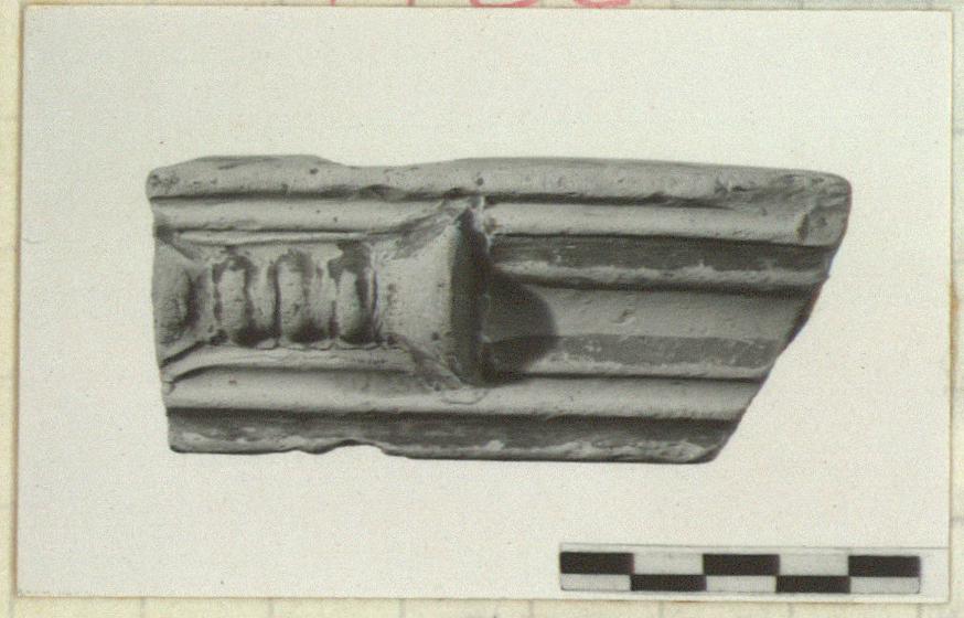 | Description: | Broken on three sides. Fragment of overhang of louterion rim, with spool lug applied over moulding. Red and black glaze on mouldings and lug. Yellow (Corinthian?) clay with grits. Cf. P 29986 and Agora XII, no. 1860. | |