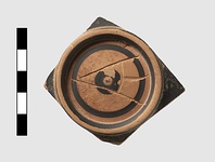 | Description: | Single fragment, broken all around. Ring foot with reserved underside with two bands and dot, reserved resting surface. Scraped groove at junction of foot and body. On underside, graffito. Black glaze. Attic clay. | |