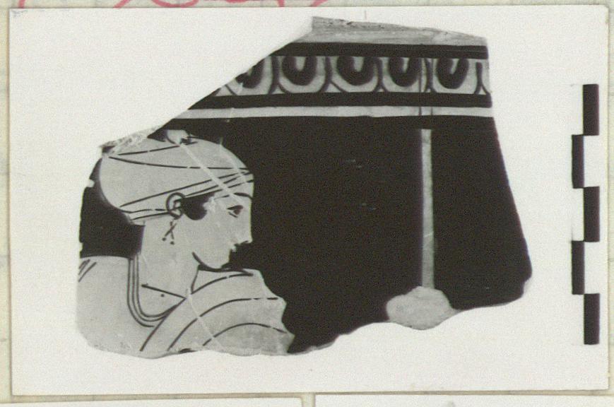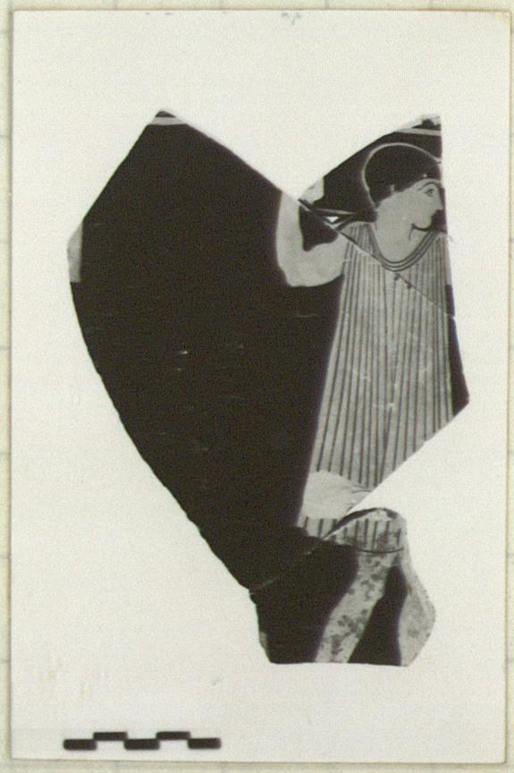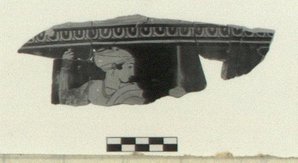 | Description: | 92 fragments preserve nearly two-thirds of rim and body, in addition to both lug handles. A) Four figures: on left, bearded man in profile to right, resting on knotted staff and wearing a mantle. To right, a youth in chitoniskos puts on a sword. To his right, a woman in chiton, mantle and sakkos stands frontally looking right and holding a spear in her right hand and a scabbard in her left. On far right, shanks and front of top of head of youth in profile, moving left and carrying a spear in one hand and a helmet in the other. b) Arming: On the left stands youth in chitoniskos facing right. In center, lower half of mantled youth moving left. On far right is mantled male figure resting on staff in three-quarter back view to left, with left hand extended. Both scenes framed above and below by egg patterns, also on top outer edge of handle. Two reserved bands 0.56m. apart inside rim, and bottom of handle in reserve. Attic clay. ADDENDA Section nos. that belong to this pot: ΒΓ' 173, ΒΓ' 183, ΒΓ' 191, ΒΓ' 192, ΒΓ' 193, ΒΓ' 194, ΒΓ' 195, ΒΓ' 200, ΒΓ' 349, ΒΓ' 515, ΒΓ' 516, ΒΓ' 517, ΒΓ' 518, ΒΓ' 519. Lenningrad Painter/ J. Oakley. | |