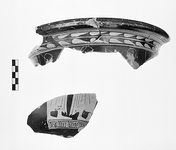 | Description: | About one-fourth of rim preserved, mended from six pieces. Flaring rim with rounded lip, reserved band at lip and below lip inside. Rim pattern is stylized laurel between reserved bands, offset from body. Lower band has miltos. Groove with miltos just above laurel pattern. Red figure scene shows three men; at right a draped figure facing left; in center, figure facing right, holding a staff or javelin upright; at left, a figure facing right. (ADDENDA Villa Giulia Pt., J. Oakley, 18/5/1984; same vase as P 30028 and perhaps P 30040.) c) Single fragment broken all around. At right a figure clad in chiton and himation stands to right. In center, a nude male faces front. He carries a shield on his left arm, and a spear. At left, traces of another draped figure. (ADDENDA Villa Giulia Pt., J. Oakley, 18/5/1984; same vase as P 30009 and perhaps P 30040.) Black glaze inside and out. Pink clay. | |