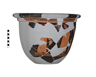 | Description: | a) Mended from twenty pieces, broken on three sides. At right stands Artemis wearing chiton, himation, a wreath in her hair. She faces left, her weight resting on her left foot. She holds a phiale in her extended right hand. In front of her stands a small deer who looks up at her, smiling and expectant. At center, a draped figure standing frontally with traces of a laurel branch to left. This must be Apollo. Further left, a draped figure walking right holding an oinochoe in his left hand. b) Single fragment, broken all around. Head of Apollo, facing left. He is bare-chested, wears a woolen fillet and wreath. In front of him is a laurel branch. (May come from side B). c) Single fragment, broken all around. A right hand holding a laurel branch upright, probably to be associated with fragment b). Note similarity of laurel leaves. Ground line is maeander and saltire squares. Flaring rim with round projecting lip. Below lip are band of ovoles and dots on offset surface. Reserved band inside, below rim. Trace of loop handle. Additional fragments: a) Two fragments join P 30019 a giving more of Leto's peplos and oinochoe, another joins Apollo. d) Nine joining rim fragments. e) Four joining rim fragments on which is preserved part of the head of Leto and a leaf from Apollo's branch. f) Single non-joining rim fragment. g) Single non-joining rim fragment. Formerly P 30026: Broken all around. Mended from four pieces. At left, a figure wearing a himation stands frontally. To his left is a tree trunk. At right, one foot and the lower chiton of a woman striding right. Ground line is continuous maeander and saltire squares. Black glaze, greenish on inside. Orange clay. ADDENDA P 30026 same vase. Hermonax, J. Oakley, July 1981. | |