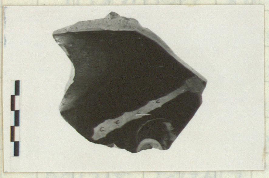 | Description: | Single fragment from below rim, broken all around. A wild looking man, probably a centaur, faces right and brandishes a large knobby club in his right hand. Hair and beard impressionistically rendered. Edge of rim offset above. Reserved band inside. Black glaze inside and out, miltos on figure. | |
