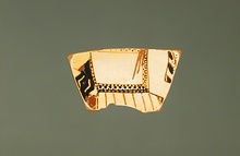 | Description: | Single fragment broken on all sides. Edge of stem preserved. The middle torso of a figure painted on a white ground. To right, an arm bent at the elbow? Painted in black, brown and dull red. Black glaze on outside. Red clay. | |