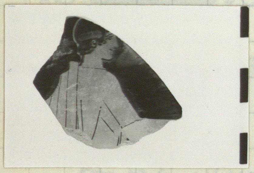 | Description: | Single fragment, broken all around. Youth wearing himation faces right, his right arm extended. Thin wash on inside. Green to black glaze. Orange clay. | |