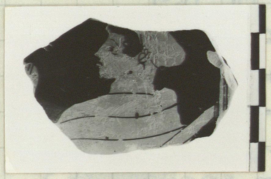 | Description: | Single fragment, broken all around. From shoulder of a closed vessel, inside entirely unglazed. Woman heavily draped in himation faces left. She wears a sakkos. Shiny black glaze. Orange clay. | |