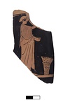 Description:   Single fragment, broken all around. Woman wearing chiton and himation and sakkos on head stands facing right. Her right arm is uplifted, her left held in front of her. In front of her is a wool basket.