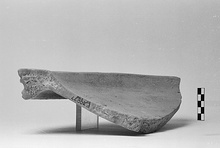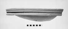 | Description: | About one-fourth of rim preserved. Projecting overhanging rim with moulded profile. Diagonal slashes and mouldings. Yellow-orange clay. Cf. Agora XII, no. 1876. | |