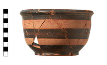 | Description: | a) Mended from nine pieces. b) Joining piece of rim. c) Non-joining rim fragment. Raised base with slightly recessed underside. Underside and resting surface reserved. Lower body rounded, upper wall nearly vertical. Rim thickened outward. Trace of horizontal loop handle now missing. On outside three horizontal glazed bands, two unglazed bands with miltos; inside glazed. Black clay. Red glaze. | |