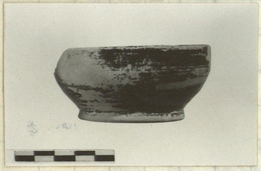 | Description: | Mended from two pieces. About three-fifths preserved. Ring foot, upper wall slightly inclined. Peeling black glaze. Pink clay. | |
