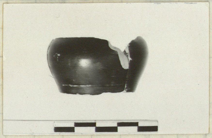 | Description: | Mended from three pieces. Fragments missing. Recessed underside reserved with three circles and dot. Lower wall slightly concave; upper wall curves in and is convex. Black glaze. Pink clay. | |