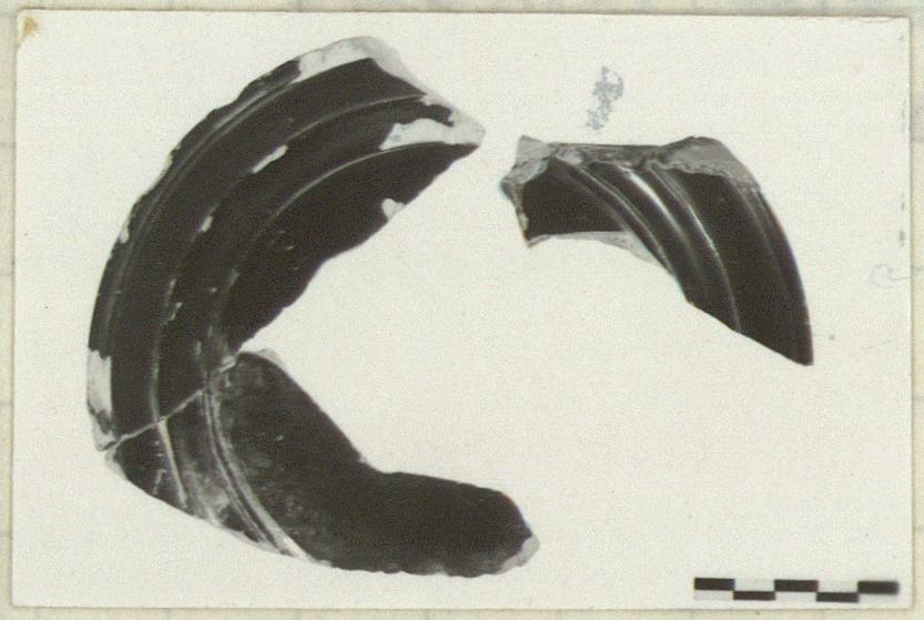| Description: | a) Mended from two pieces, about one-fifth of rim. b) Single rim fragment. Thickened rim with convex outer face, grooved above and below. Lower exterior concave. Ring foot with concave innerface, recessed underside. Interior has broad rim with two ridges. Glazed all over. Orange clay. | |