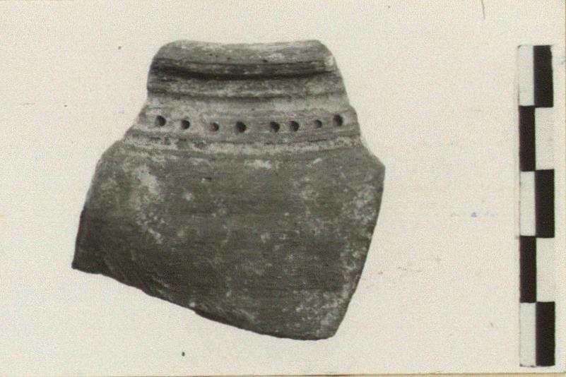 | Description: | Part of body and rim of kernos. Rim out-turned. Small holes in groove around rim. Reddish clay with traces of white paint. | |