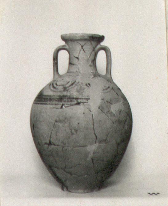 | Description: | Mended from many pieces and restored in plaster. Simple foot with flat underside; slightly uneven ovoid body. Strap handles, profiled lip. Two lines below belly; shoulder is main area of decoration. Three bands at bottom. Above these on each side are two spirals. On handles, a cross, which continues down ending in a loop on either side of handle. Band on inside and outside of lip. Submycenaean. Brown glaze. Pale yellow clay. Cf. Styrenius (1967), Submycenaean Studies, fig. 50. ADDENDA V. Desborough has seen this vase and suggests a date in the 11th c. | |